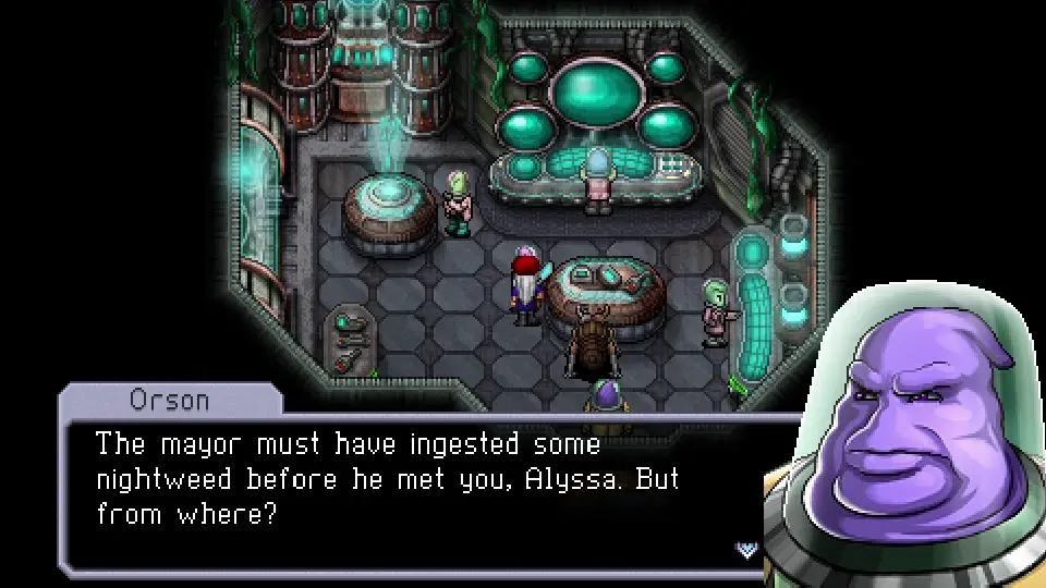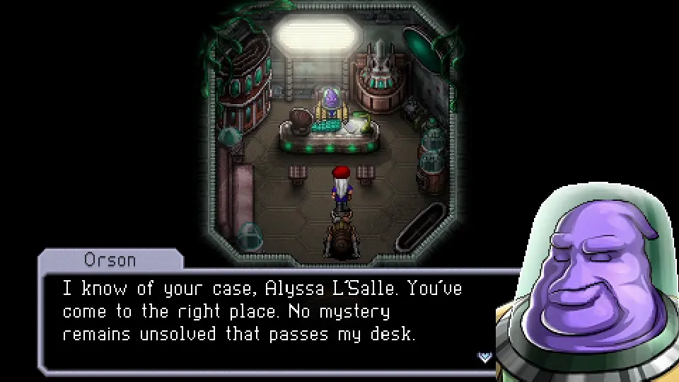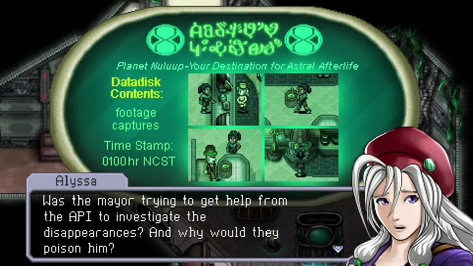 We go to a new planet. The mayor welcomes us, but he's poisoned during our conversation. Now we're branded murders, and have to prove our innocence. We get a Private Detective party member in Orson!