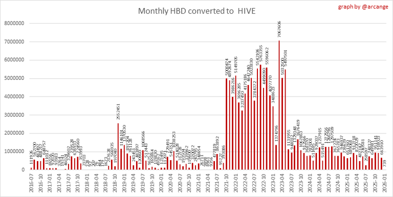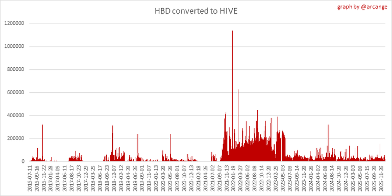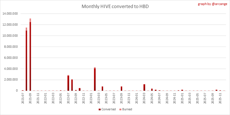 These graphs show the number of HIVE effectively used by the conversion process (HIVE converted and 5% HIVE fee which is burned) each day and month when requests to convert HIVE to HBD have been finalized.
