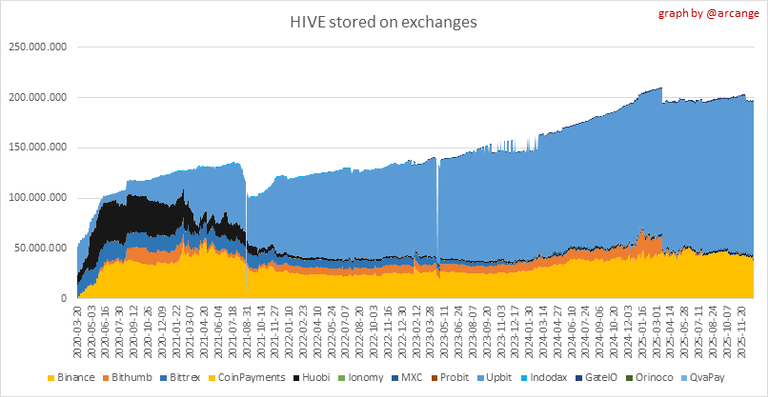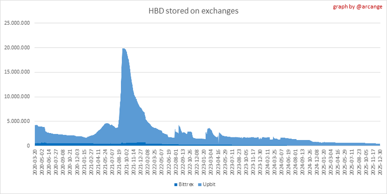 These graphs show the daily evolution of HIVE and HBD stored on the exchanges where they are listed.