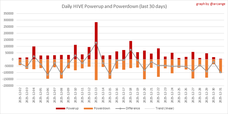 This graph shows the daily HIVE power-up, power-down, and the resulting variation over the last 30 days. The table shows the topmost power-ups and power-downs of the day.