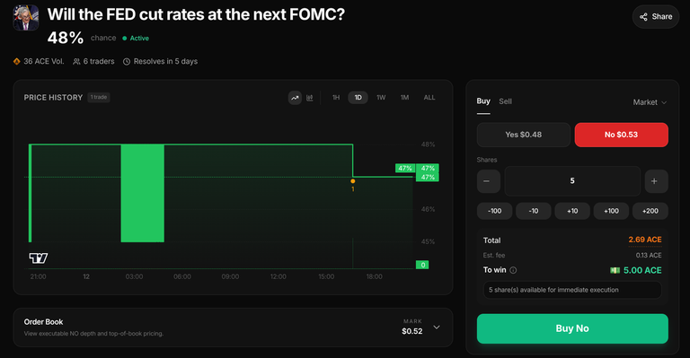 There is space left for few more users to try out predictions markets on HIVE and have extra funds to test out their predictive skills. A total of 15 ACE can be accessed for free by depositing a total of 10 ACE. That is exactly what I did and I recommend users to try it out. The risk to reward ratio is very good IMHO.